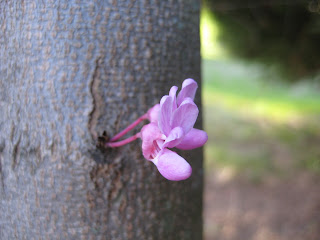 Some unknown trees in the backyard with really pretty pink blossoms and heart-shaped leaves.